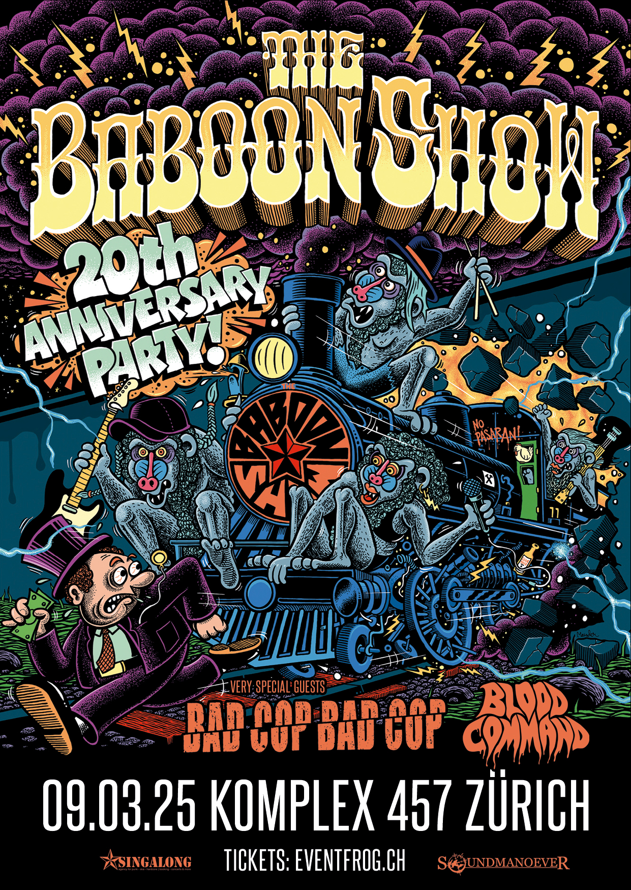 Oddballs we salute you! Die schwedische Dampflokomotive The Baboon Show nimmt wieder Fahrt auf und brettert mit Volldampf ihrem 20-Jahre-Jubiläum entgegen. Als einer der spannendsten Live-Acts Europas kombiniert das schwedische Quartett eingängige Riffs mit unfassbarer Energie und purer Euphorie zu einer mitreissenden, hemmungslosen und überragend guten Show. Harter Rock wechselt mit ruppigen Punk-Stompern und politischen Arbeiterliedern, immer mit starken Refrains und erschreckend eingängig.