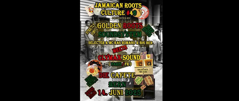 Dieses mal zu Gast an der Jamaican Roots Culture sind Freunde von Clymax Sound aus Paris. Sie teilen an diesem Abend ihre musikalischen Leckerbissen mit dem Berner Publikum. Wie üblich kommt der Sound vom Golden Roots Soundsystem und direkt ab Schallplatte. Authentisch-jamaikanische Vibrationen sind sicher.