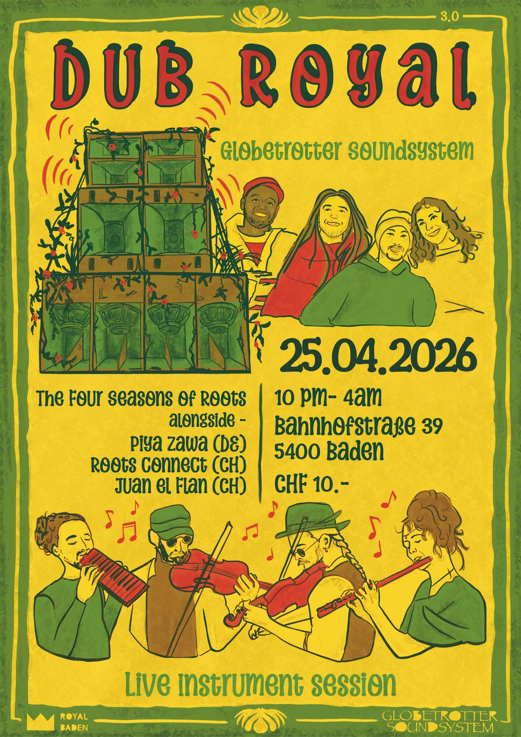 Zusammen mit den Gästen von Roots Connect und The Four Seasons of Roots, Piya Zawa und Juan El Flan werden euch feinste Reggae, Dub und Steppers Tunes um die Ohren gehauen die zudem mit Live Instrumenten verfeinert werden. Macht euch bereit für die Vibrationen. Come along, bring your skanking shoes and good vibes!!!